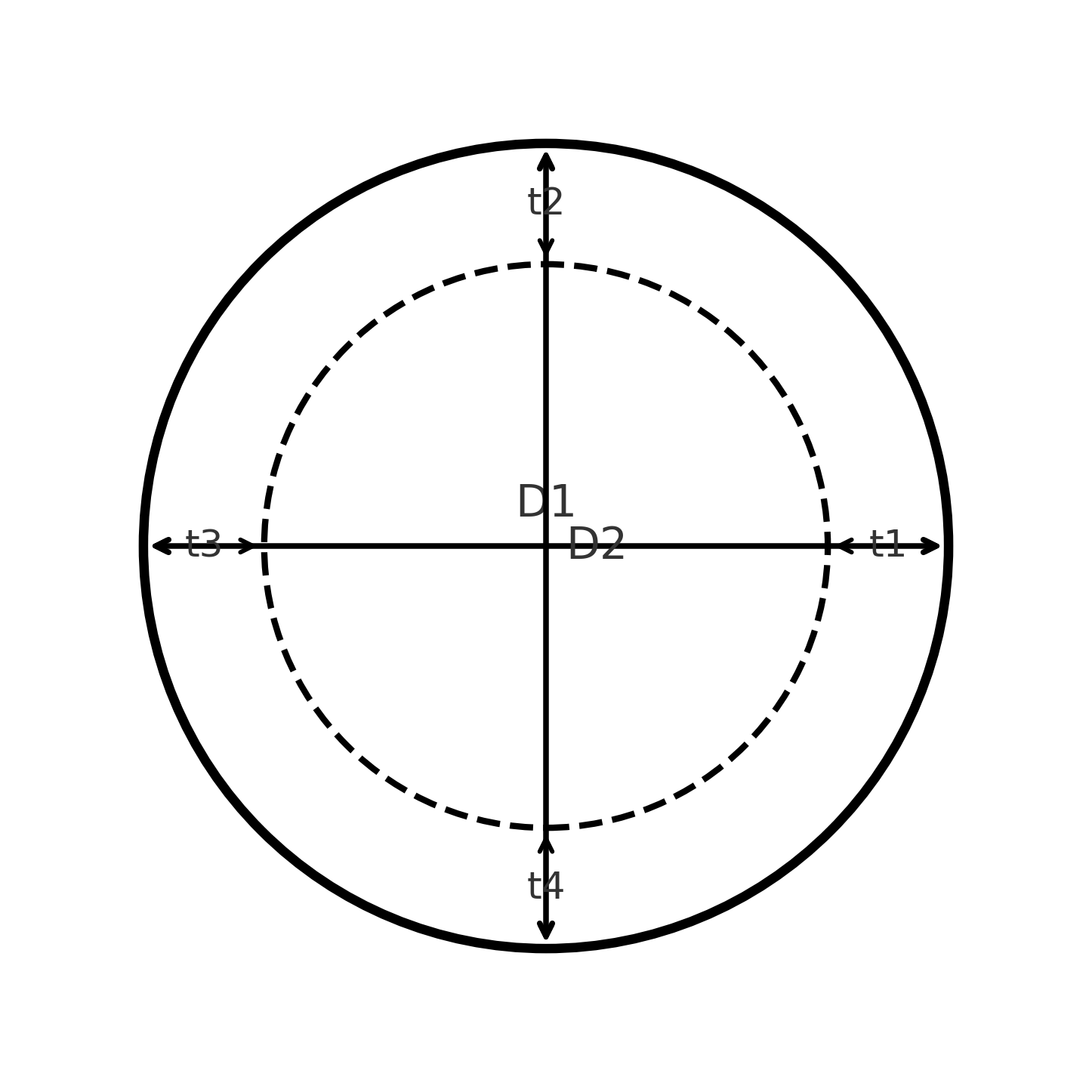 O diâmetro externo (D) e a espessura da parede (t) devem ser medidos com paquímetro. O diâmetro externo deve ser medido em duas direções ortogonais (D1 e D2) e a espessura da parede deve ser medida em quatro pontos (t1, t2, t3 e t4), conforme a Figura 2.
